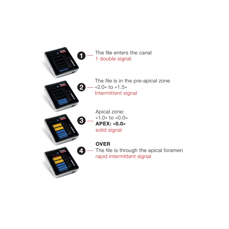- A túlzott beavatkozás elkerülése érdekében ajánlott a tűt az endodontikus vonalzóra helyezni azon a ponton, ahol a Propex Pixi „0,0”-t jelez, és a mért tűhosszúságból legalább 0.5mm-t levonni.