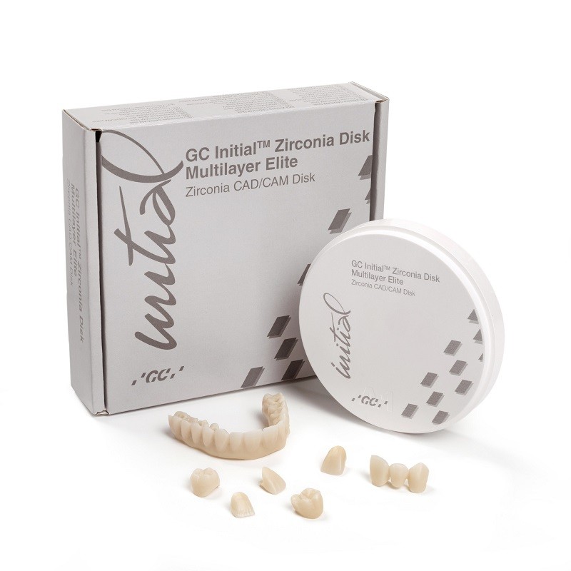 • GC Az Initial Zirconia Disk Multilayer Elite elősinterezett cirkónium-dioxid nyersdarabok, amelyeket CNC marógépekben használnak koronák, hidak, betétek, felrakások, héjak és cirkónium-dioxid rekonstrukciók gyártásához kétrészes felépítményekhez és hibrid felépítményekhez fogpótlásokhoz.