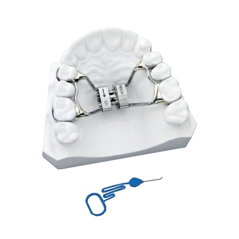 - 2 Ni-Ti Memoria Leaf rugóval felszerelve – folyamatos, kalibrált erők felszabadulását teszi lehetővé, elősegítve ezzel a felső állkapocs íve tágulását