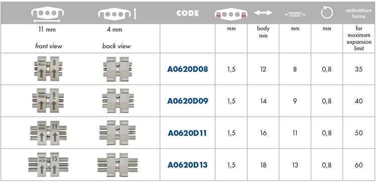 - 2 Ni-Ti Memoria Leaf rugóval felszerelve – folyamatos, kalibrált erők kibocsátását teszi lehetővé, elősegítve ezzel a felső állcsont íveinek tágulását