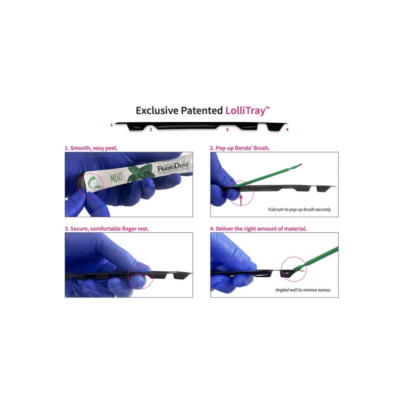 • Minden egység egy adag0.3ml-t és egy Brenda Brush applikátort tartalmaz, amely lehetővé teszi a lakk keverését az alkalmazás előtt, így biztosítva az egyenletes fluoridszintet minden alkalmazásnál