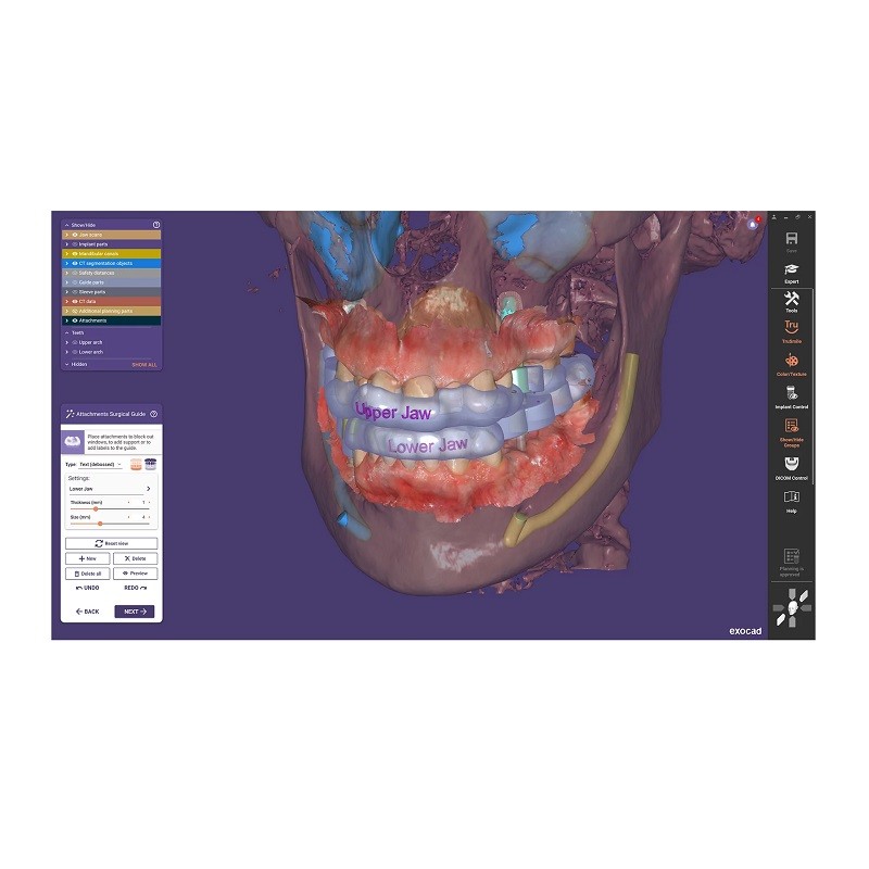 - Ha az implantátum tervezése és a sebészi vezető kialakítása a maradék fogazat eltávolítása előtt történik, az exoplan lehetővé teszi a virtuális fogeltávolítást az optikai szkennelésen, szimulálva a későbbi szájüregi helyzeteket, így létrehozva a sebészi vezető kialakításához szükséges teret
