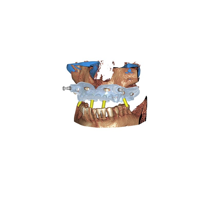 - Teljes szájrehabilitáció implantátumtervezéssel és sebészeti vezető kialakításával mindkét íven egyszerre