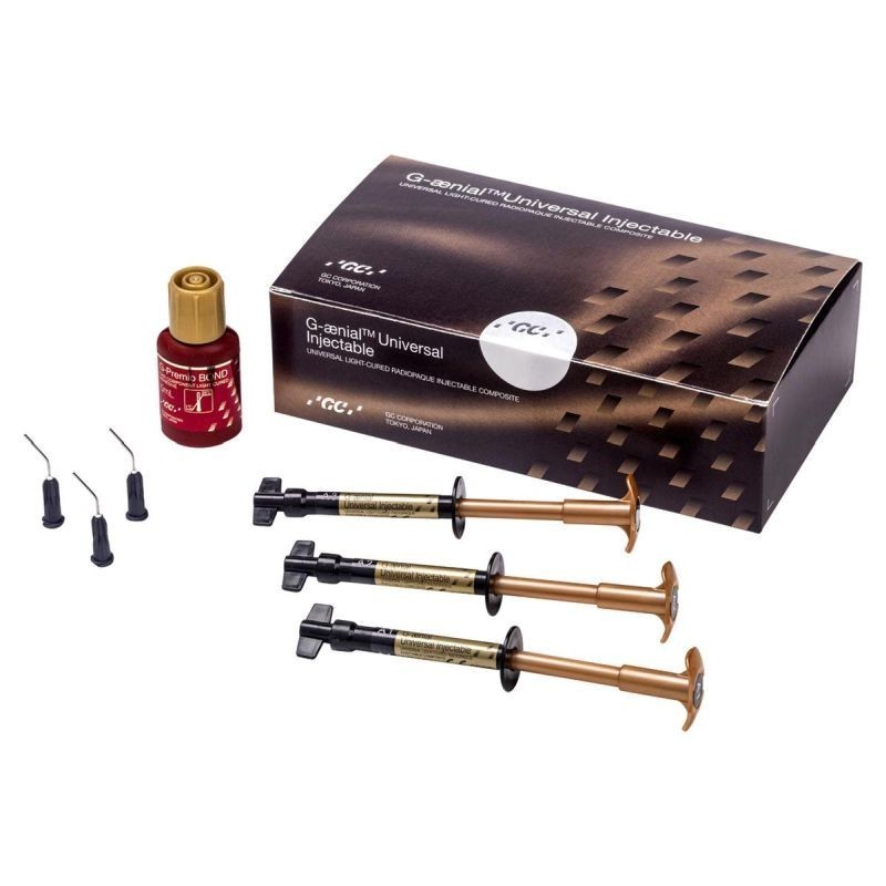 - G-aenial Universal Injectable + G-Premio Bond Kit – 3 fecskendő G-aenial Universal Injectable x 1 ml (1 x A1 + 1 x A2 + 1 x A3) + 1 G-Premio BOND x 5 ml + 20 applikátorhegy + 30 hosszú tű + 3 fényvédő sapka