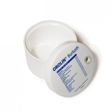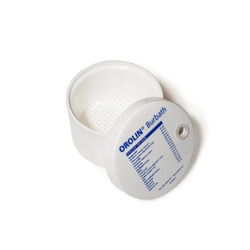 - A tartályból, az oldat szűrésére szolgáló rácsból és egy kék fedélből áll, amelyen feltüntették az Orolin Burbath fertőtlenítő tisztítószer hatékonysági spektrumát és hatástartamát