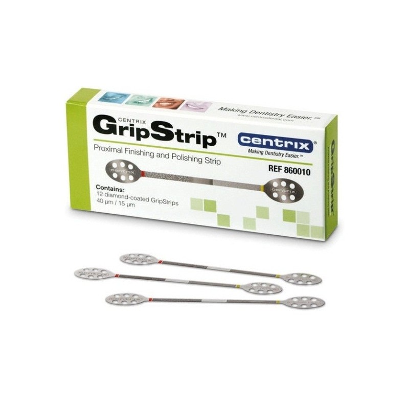 Gyémántbevonatú interdentális csíkok a proximális területek simításához és polírozásához. A GripStrip segítségével egyetlen eszközzel végezheti el a simítást és a polírozást. A GripStrip egy proximális simításra szolgáló fémcsík, amely két különböző méretű gyémántbevonatú felülettel rendelkezik: 40 um a felesleges anyag eltávolításához és 15 um a simításhoz és polírozáshoz. A GripStrip segítségével kontúrozhatja és letörheti a preparált üreg széleit, vagy eltávolíthatja a felesleges anyagot a tömésekből vagy a protetikai munkák széléről. A GripStrip egy nagyon tartós, mégis rugalmas eszköz, amely törés nélkül elérheti a görbe területeket. A középső, nem aktív „szabad zóna” lehetővé teszi a szalag könnyű behelyezését az interproximális területekre. A szalag végei szélesek és perforáltak, hogy a lehető legjobb tapadást biztosítsák. A GripStrip simítószalagok autoklávozhatók és újra felhasználhatók, ami csökkenti a költségeket. A GripStrip ideális a proximális és incisalis területek polírozásához, kontúrozásához, letöréséhez, simításához és simításához.