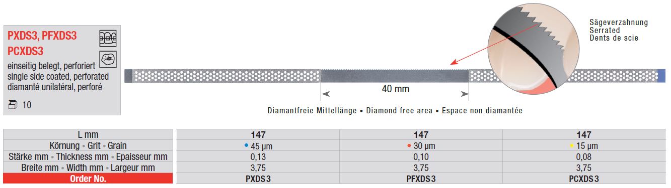 - Gyémántos simítószalagok fogazott élekkel, perforáltak, egyik oldalukon gyémántszemcsékkel bevonva, sterilizálhatók.