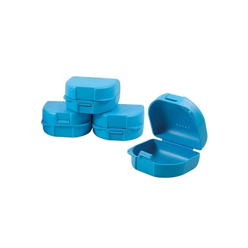 Szájdarabok szállítására szolgáló műanyag doboz, szellőzőnyílásokkal, kék színű.