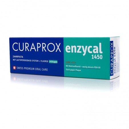 A Curaden Curaprox Enzycal 1450 ppm egy enzimeket és fluoridot tartalmazó fogkrém, amelynek fluorid-tartalma mérsékelt (1450 ppm). Az egészséges szájnyálkahártya-flóra révén jobban védve lesz a fogszuvasodás és a fogágybetegségek ellen. Az Enzycal 1450 ppm egy természetes, tartós szájápolást biztosító fogkrém.