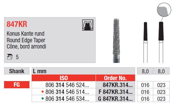 Kerekített hegyű gyémánt kúpos fúrók FG 847KR - Gyémánt eszközök precíz előkészítéshez