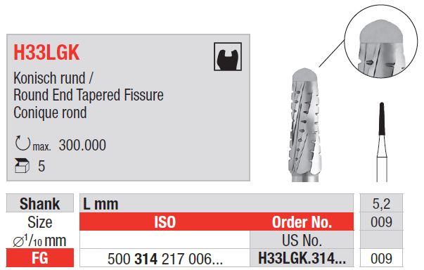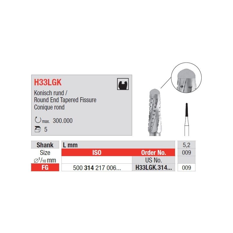TC Bur FG H33LGK kerek kúpos fejű fúró - tartós volfrámkarbidból, rozsdamentes acélból, nikkelbevonat nélkül