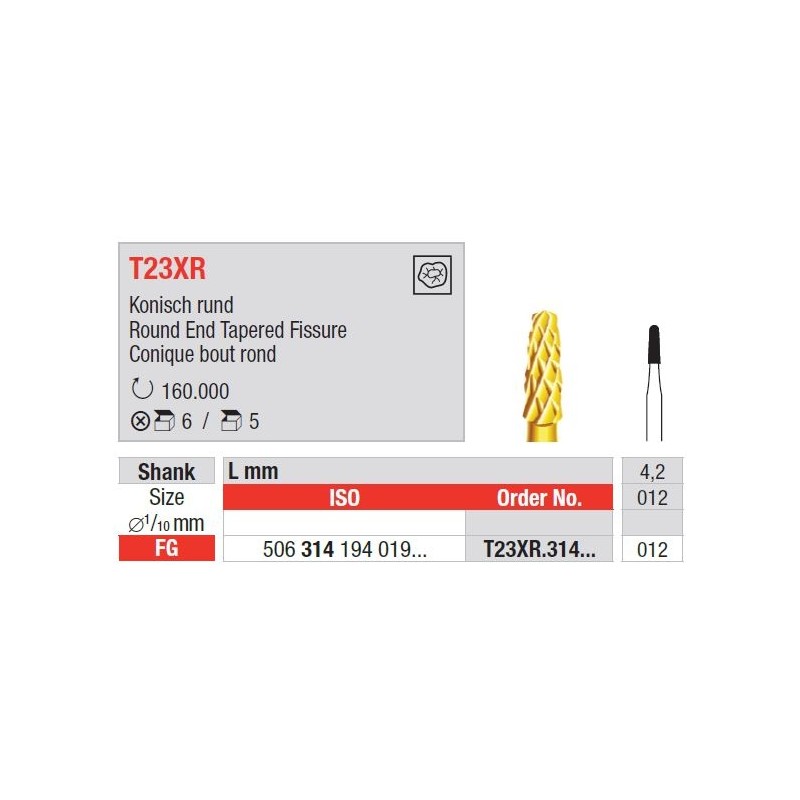 TC Bur FG T23XR kerek kúpos fejjel – Volfrámkarbid fúró az amalgám és kompozit anyagok könnyű eltávolításához.