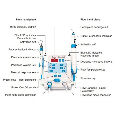 - Calamus Dual guttapercha kondenzációs eszköz - 1 Calamus Dual vezérlőegység + 1 S elektromos fűtő dugó + 10 db 20G guttapercha patron + 10 db 23G guttapercha patron + 1 db patroncsere csavar + 1 db tűhajlító eszköz + 1 db kézidarab tisztító kefe + 1 db kézidarab védőburkolat + használati utasítás + 1 db kártya szekvencer