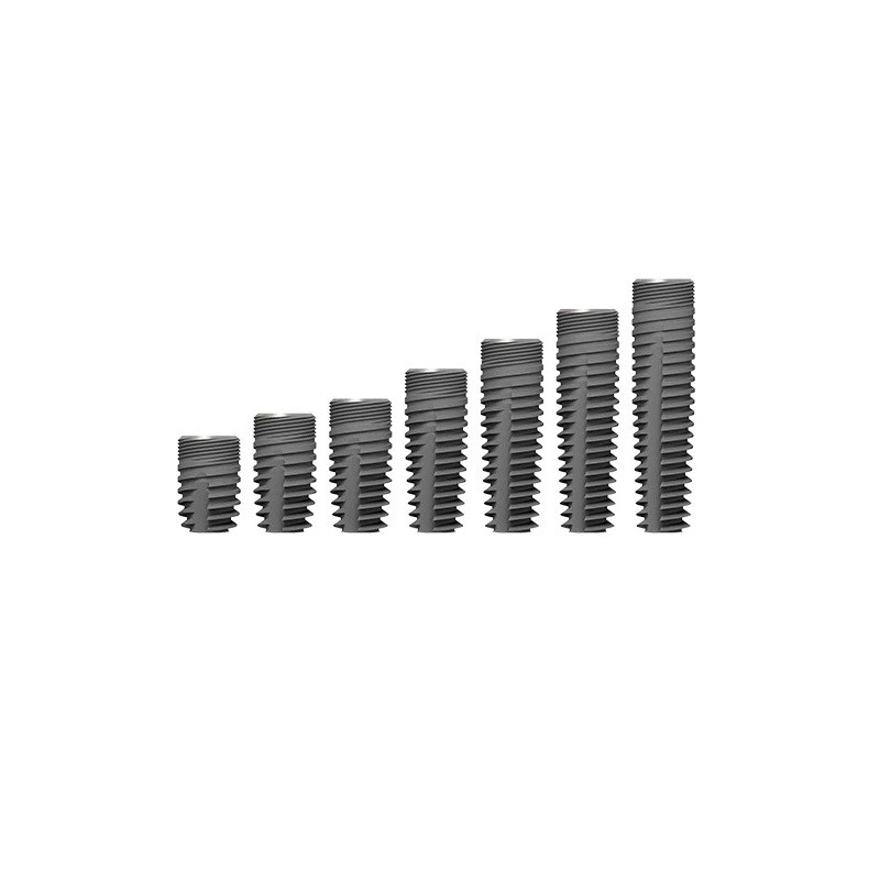 A három különböző menetes forma hatékony kezelést biztosít: a tetején – mikromenetes forma a csont megőrzése érdekében, középen – négyzetes forma a csontgerinc kondenzációja érdekében, alul – éles apikális forma a csont vágása érdekében.