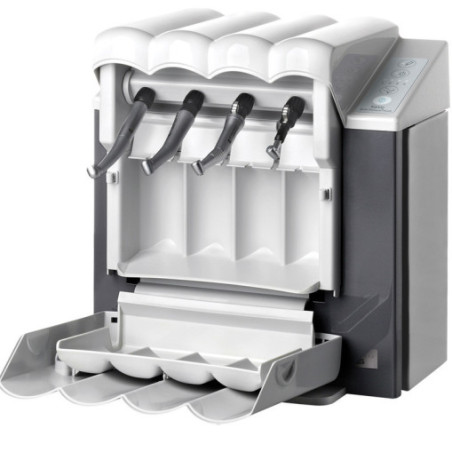 Zárt rendszerű tisztító berendezés. 4 kézidarabot tisztít és olajoz egyszerre, gyorsabbá, egyszerűbbé és biztonságosabbá téve a kézidarabok ápolását. Sűrített levegős csatlakozással.