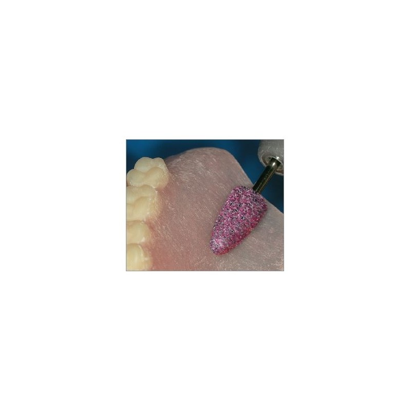Rubin eszköz, kétféle szemcseméretben kapható, standard és finom, fém rögzítéssel akrilhoz. Lehetővé teszi az akril fogsorok pontos beállítását hő keletkezése nélkül. Ideális puha akrilok korrekciójához és újrabázisozáshoz.
