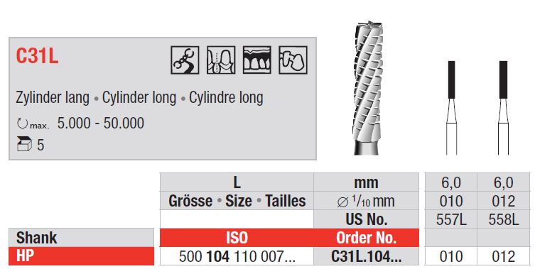 TC Burs HP vágók – C31L hengerfejjel – forgási sebesség: max. 5000 – 50 000