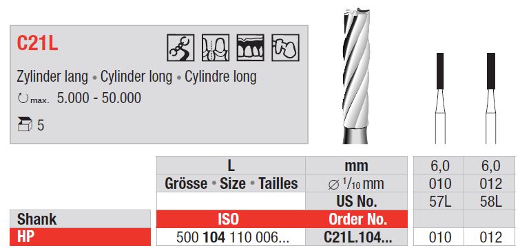 TC Burs HP vágók - hosszú hengerfej C21L - forgási sebesség: max. 5000 - 50 000