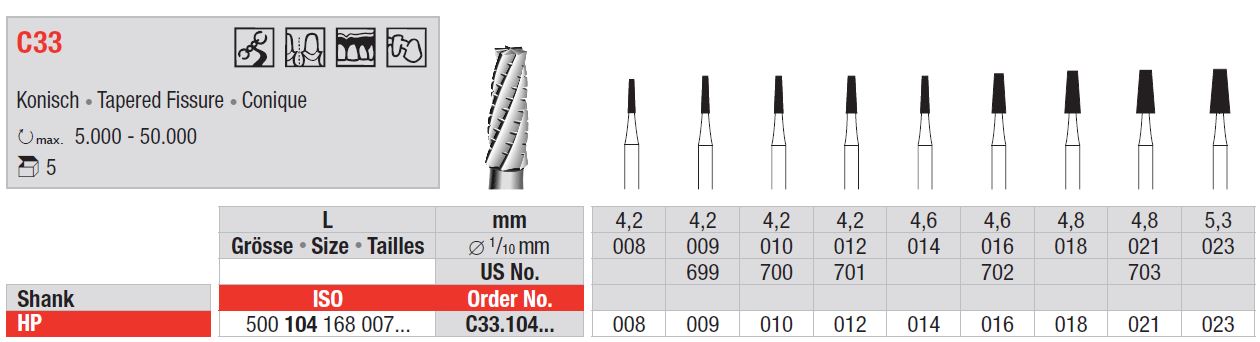 TC Burs HP vágók - kúpos fejjel C33 - forgási sebesség: max. 5000 - 50 000