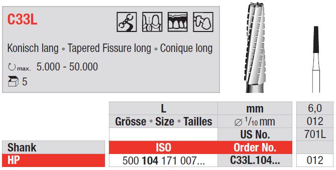 TC Burs HP vágók - hosszú kúpos fej C33L - forgási sebesség: max. 5000 - 50 000