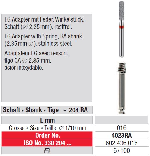 FG 4023 RA adapter – FG adapter rugóval, RA rúddal (2,35 mm), rozsdamentes acélból.