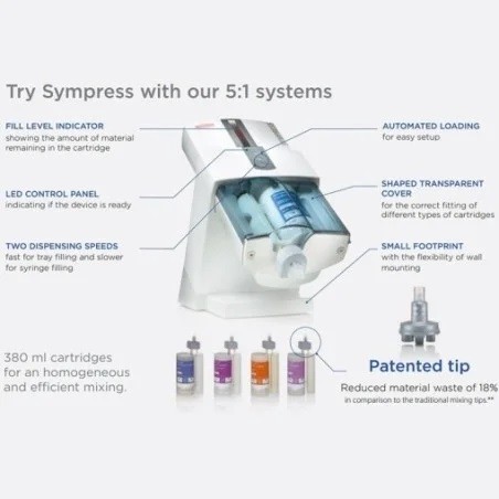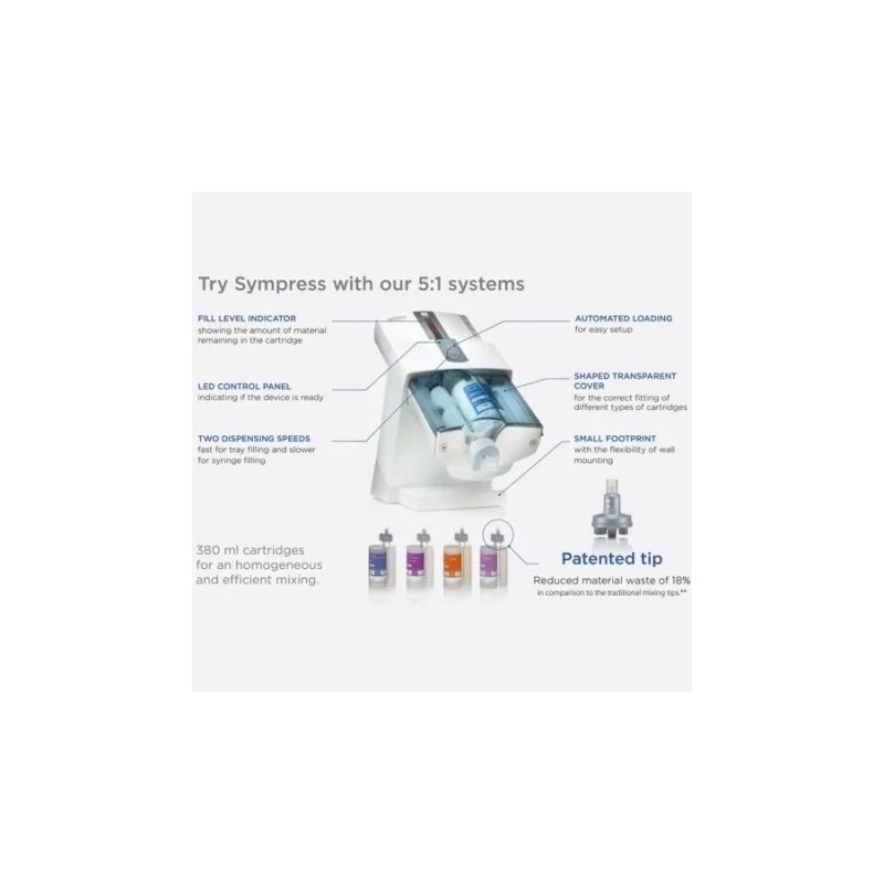 - Kompatibilis a Zhermack 5:1 patronos termékeivel (Putty, Heavy Body és Monophase) és a piacon elérhető főbb 5:1 rendszerekkel