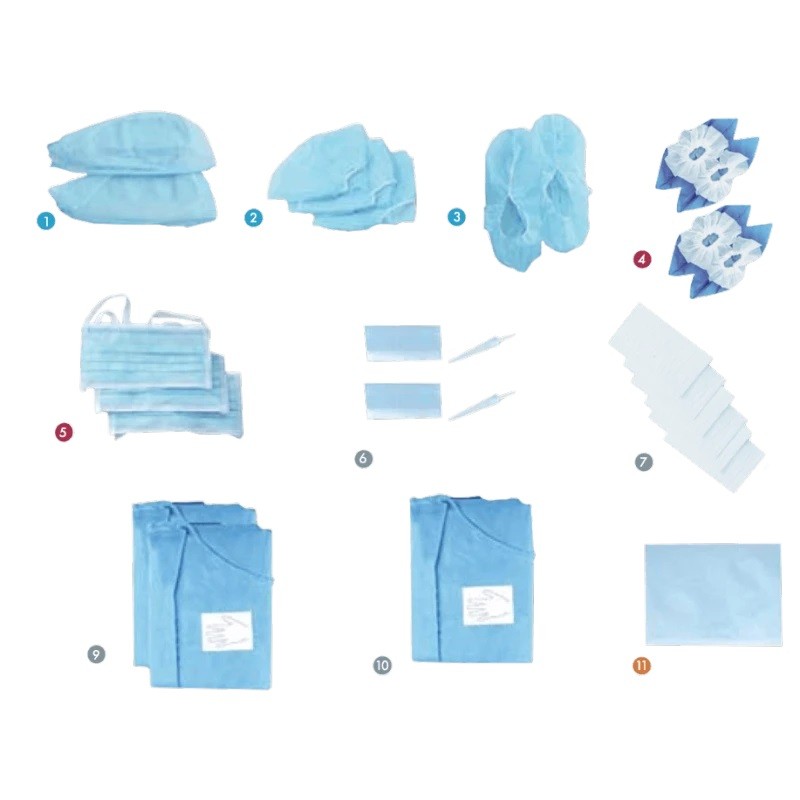 Steril készlet 28 alkatrésszel, amely az orvosi személyzet (ápoló, orvos) és a beteg számára szükséges.