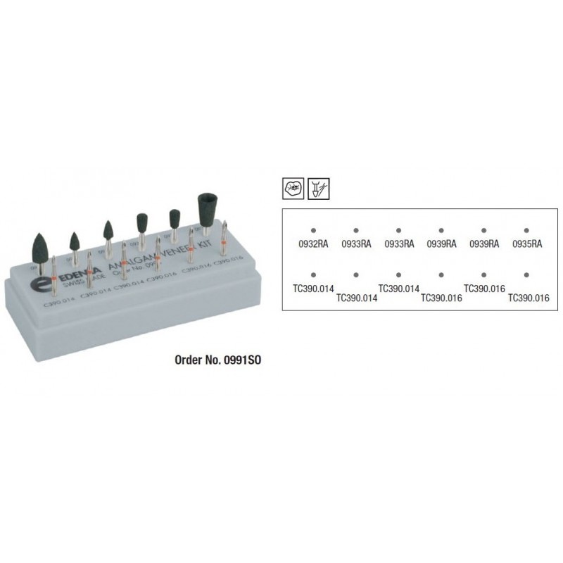 - Amalgam Veneer Kit 991SO - A készlet 6 db TC FG simító fúróval + 6 db amalgám fúróval rendelkezik az amalgám tömések finom redukciójához és simításához.