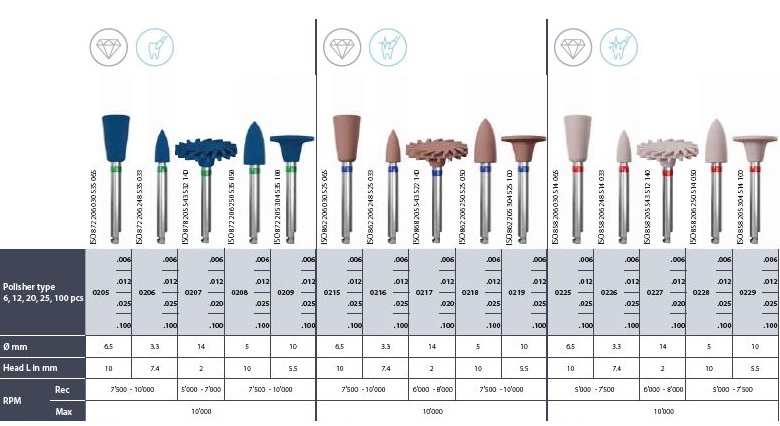 - Gyémántcsiszoló gumik minden kerámia restaurációhoz, beleértve a cirkóniumot és a lítium-diszilikátot is