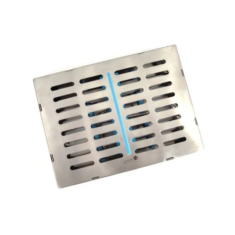 - A műszerek rozsdamentes acélból készült, autoklávozható tokban vannak tárolva, minden műszerhez külön szilikon tartóval.