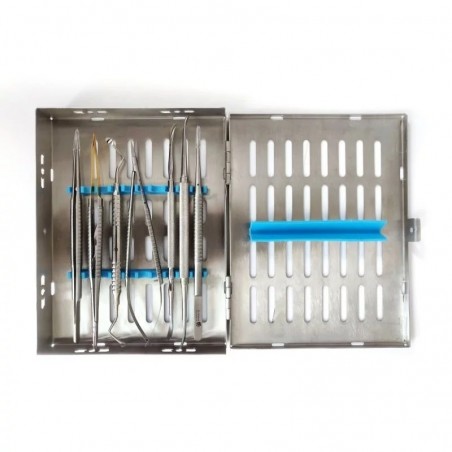 7 darabos műszerkészlet, amely fogászati rendelőkben végzett mikrosebészeti beavatkozásokhoz alkalmas.