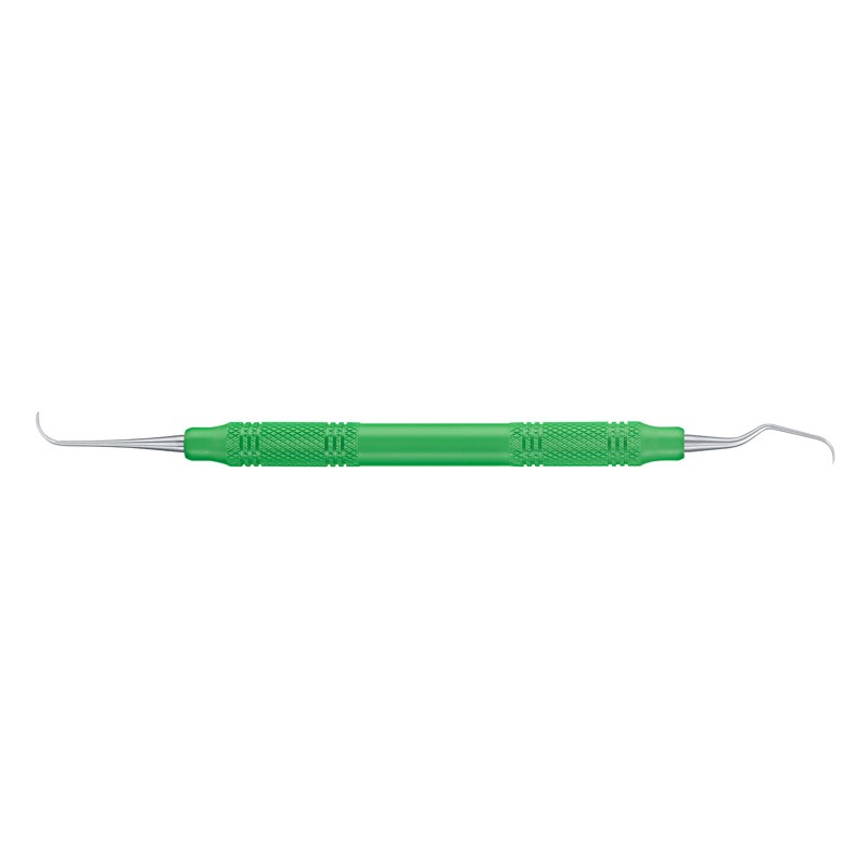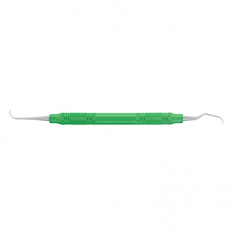 - Rendkívül vékony N128 fogkőeltávolító hegy az egyik oldalon, hosszú univerzális 5-ös küret a második hegyként, az elülső régióban végzett szubgingivális és supragingivális munkákhoz