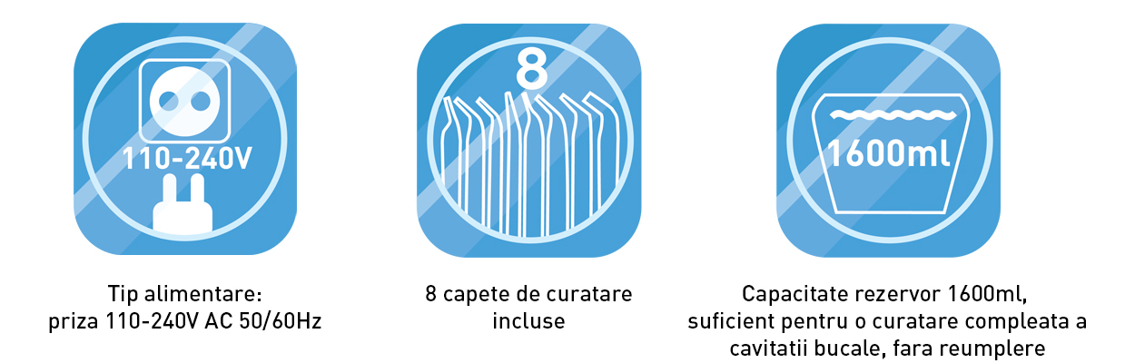 - Tisztítófejek – 4 standard fej, 1 íny alatti fej, 1 fogszabályozó fej, 1 nyelvtisztító fej, 1 fej hidakhoz, koronákhoz és nehezen elérhető területekhez.