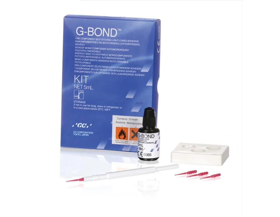 A GC G-Bond egy korszerű, önsavazó, könnyen használható, fényre keményedő adhezív, mely egyesíti a kémiai és mechanikai kötés elveit. A két funkcionális monomer, a 4-MET és a foszforsav-észter nano-töltőanyaggal kombinálva egy egyedülálló és stabil felszínt hoz létre a dentinen: a Nano Kölcsönhatási Zónát (NKZ), mely ugyanakkor a zománchoz is megbízható kötőerőt nyújt.